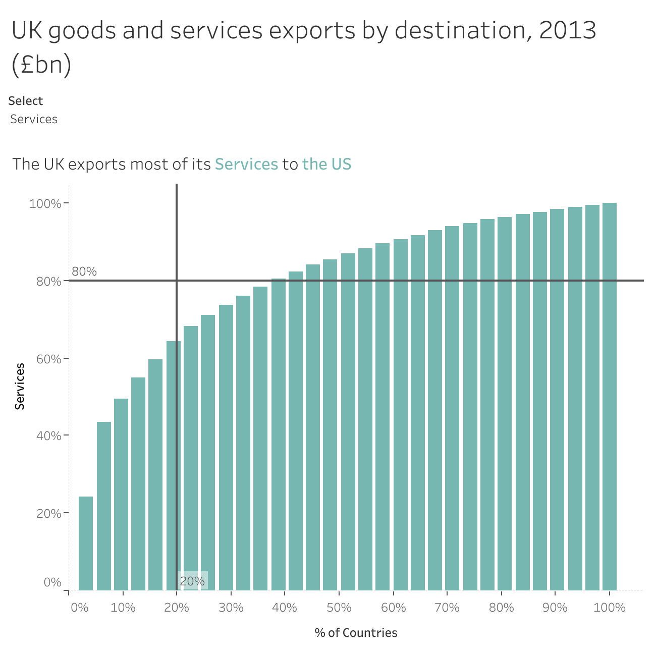 I recently saw this post from Ben Jones on simple ways of transforming tables of data in to multiple vizzes. The blog itself is a great insight in to the thought processes behind choosing a chart type for a data set and all the different ways to visualise the same set of data. The data set that Ben put together relates to exports of goods and services from the UK in 2013. I thought a better way of visualising this data would be in a Pareto chart.