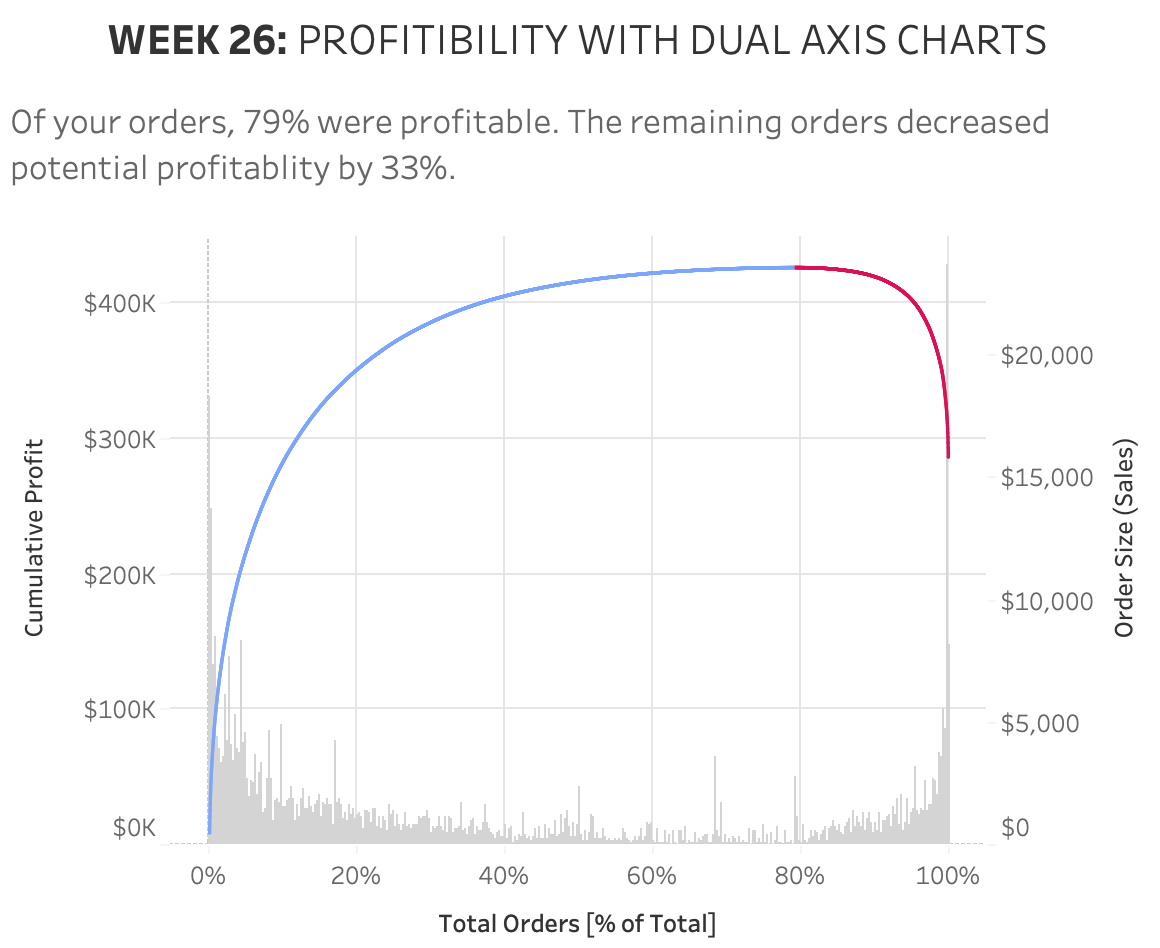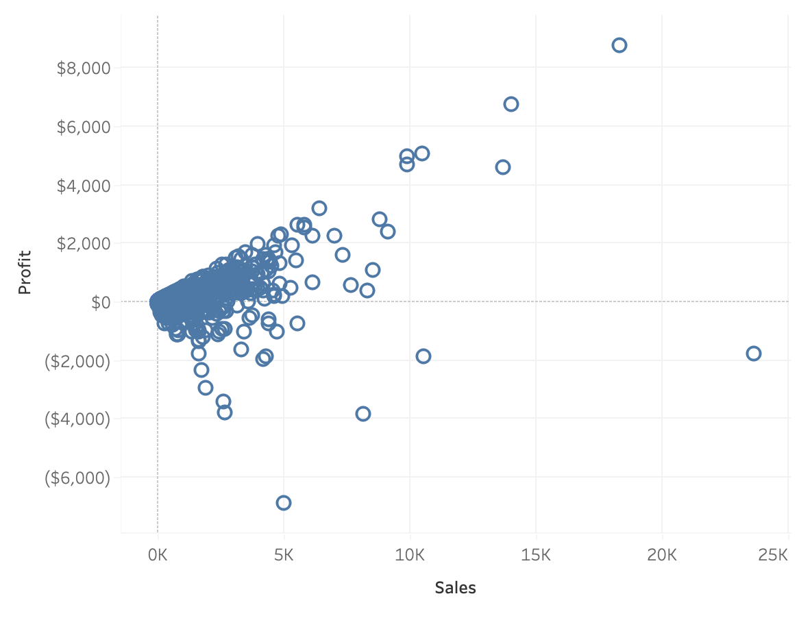 Instead of using this plot I suggest using a pareto/bar dual-axis chart, The chart still shows profit and sales by order–but now we have greater insight to which orders are driving profitability. By layering in the bar chart it adds context about order size relative to all other orders.