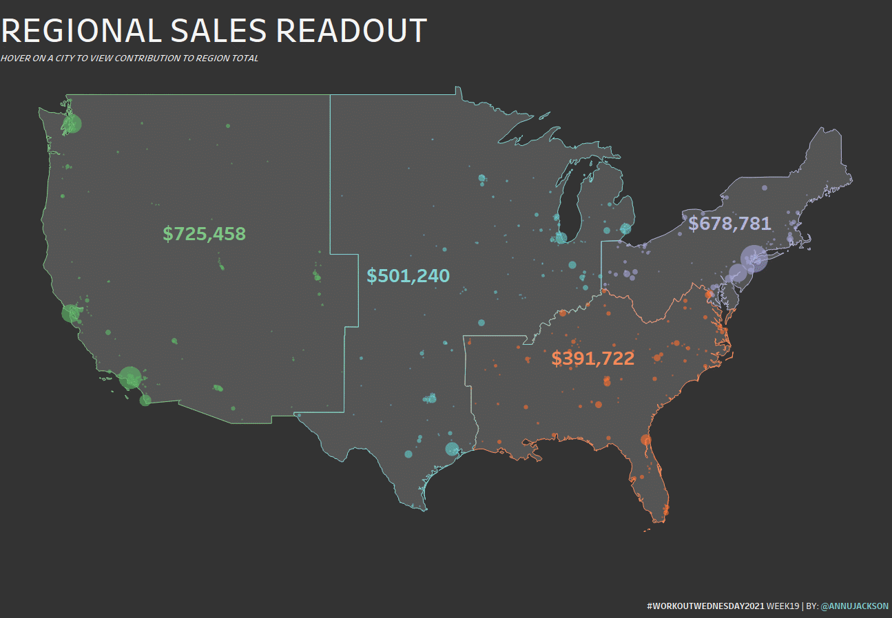 You’re tasked with recreating a Regional Readout Report where Sales teams can see the performance of various cities within their Region. They’ll be able to get more information by hovering over a city.