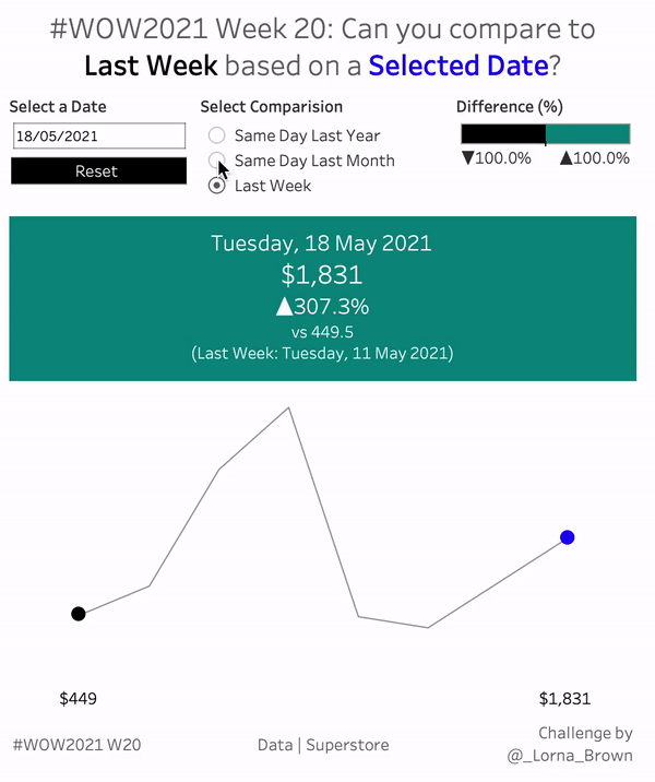 - Create BAN which compares the percent difference between the selected date and either Same Day Last Year, Same Day Last Month or Last Week