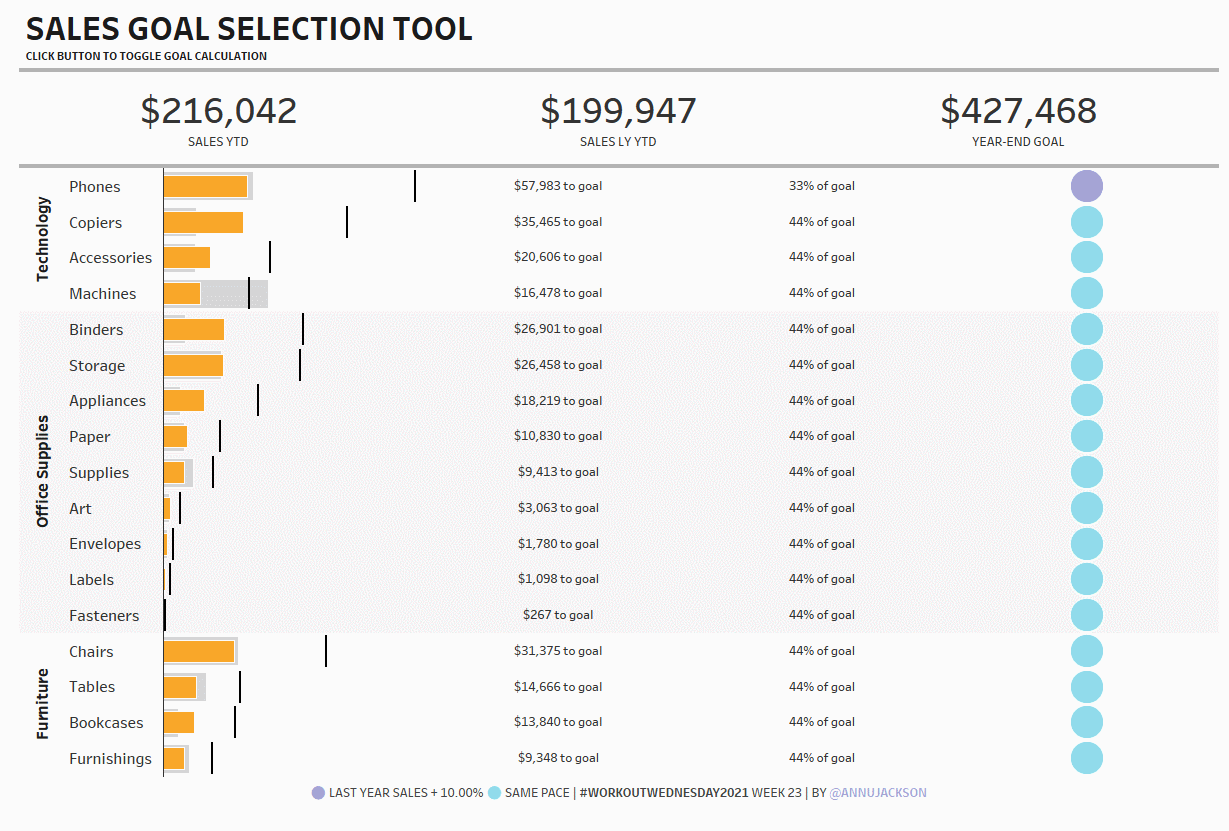 Goal calculation methodology. For “same pace” find the average sales per day for 2021, use that value to construct what a full year would be. For “last year + X%” use a parameter that has a percentage increase. I selected 10% and then hid the parameter, but you can expose it if you’d prefer!