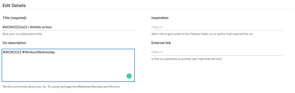 When you publish your solution on Tableau Public make sure to take the time and include a link to the original inspiration. Also include the hashtag #WOW2022 in your description to make it searchable!