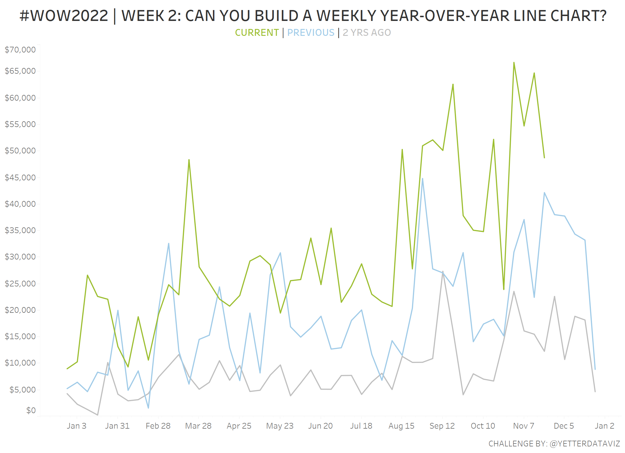 I’m excited to join the Workout Wednesday coaching team this year! For my first challenge, I’m pulling from some recent work experience. Our leadership team wanted to see weekly performance for the week ending Sunday, with the current and prior 2 years in the chart. We also needed to include the YoY% change, and the proper week ending date depending on the year.