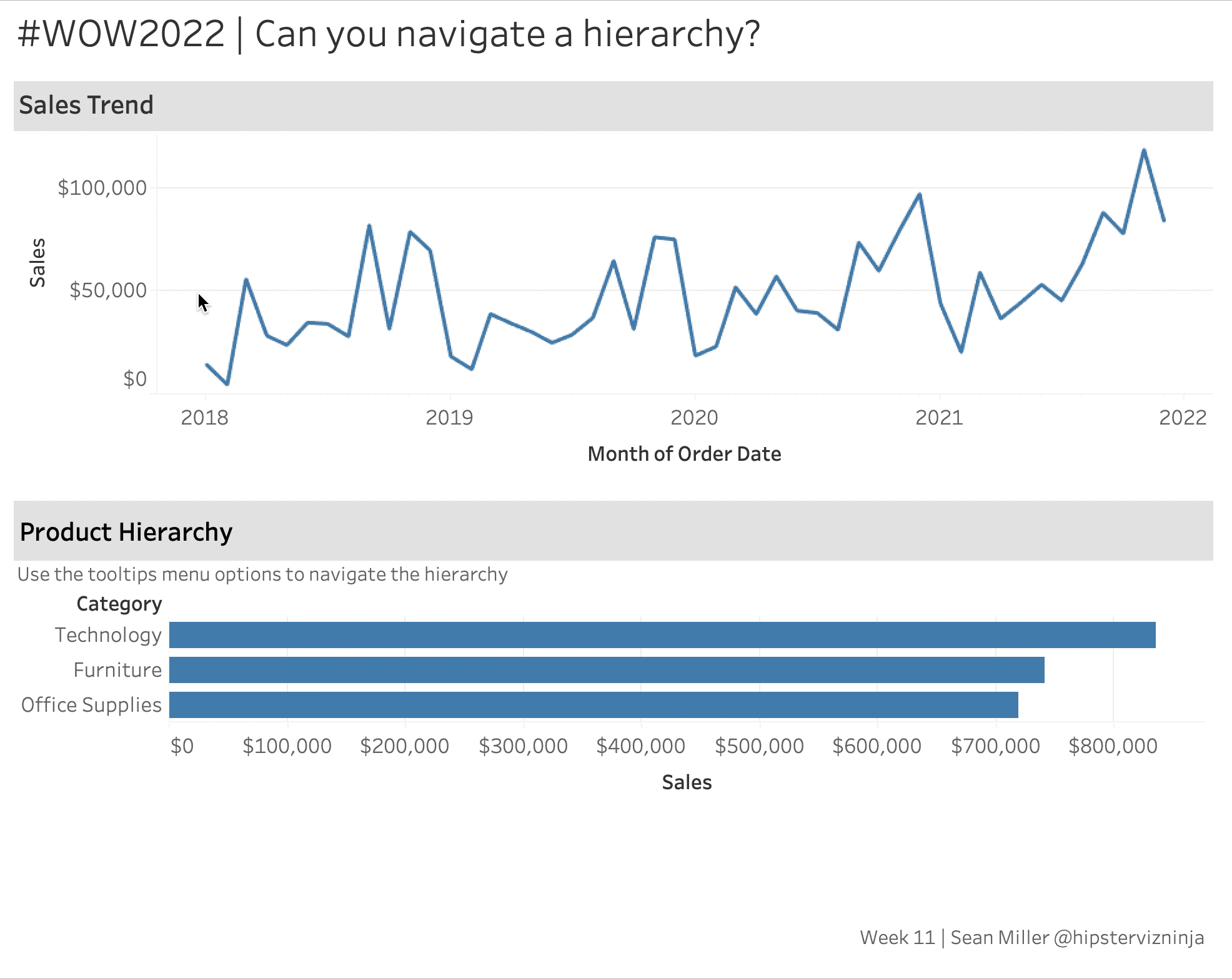 This week’s challenge is a page right out of a real-world project I worked on recently. Similar to the superstore product hierarchy, the data I was working with had multiple dimensions of high cardinality that were a hierarchy. We were looking for a way to display each level while taking up as little real estate as possible.