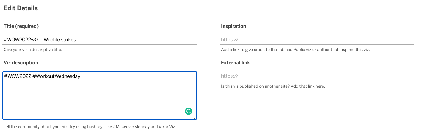When you publish your solution on Tableau Public make sure to take the time and include a link to the original inspiration. Also include the hashtag #WOW2022 in your description to make it searchable!