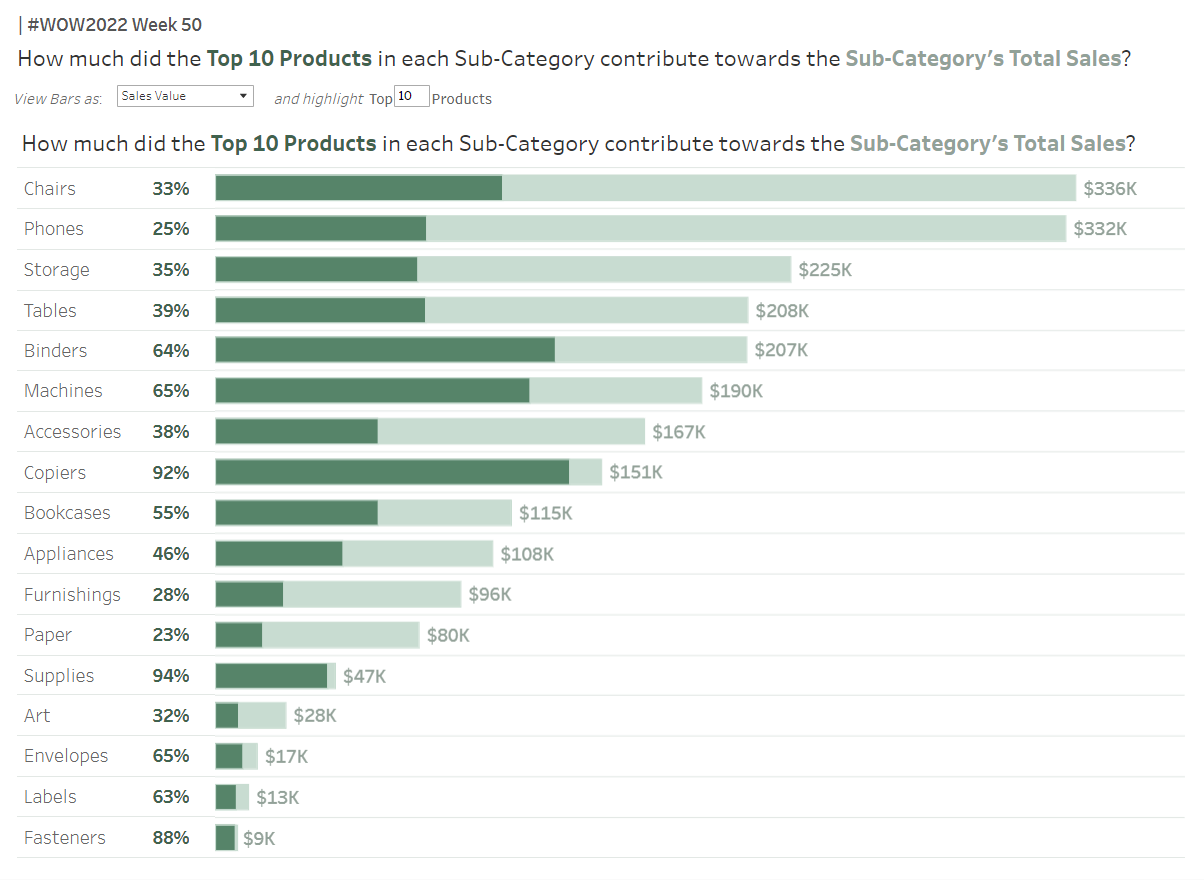 - Allow the user to Sort the bars by Total Sub-Category Sales or by the Percentage covered by the Top N Products (ie: the value calculated above)
