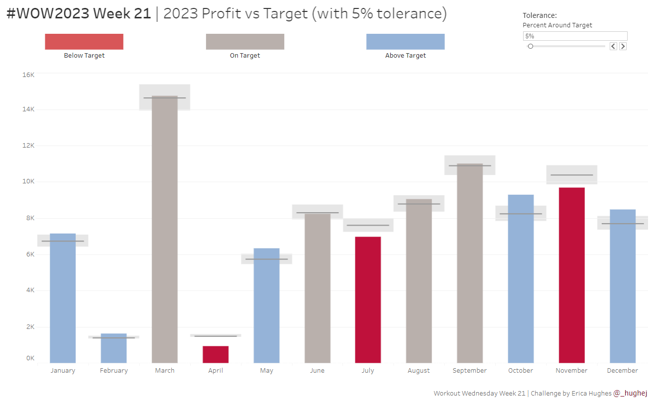 This week’s challenge is a slight twist on the classic Measure (bar) vs Target (gantt) chart. The key difference here is that we want to allow the user to select a ‘tolerance’ around the specific Target value. We only want to highlight months where profit was Above or Below the permited tolerance.