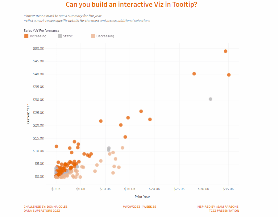 - Build a scatter plot that plots the Sales for the current year (2023) against the Sales for the prior year (2022).