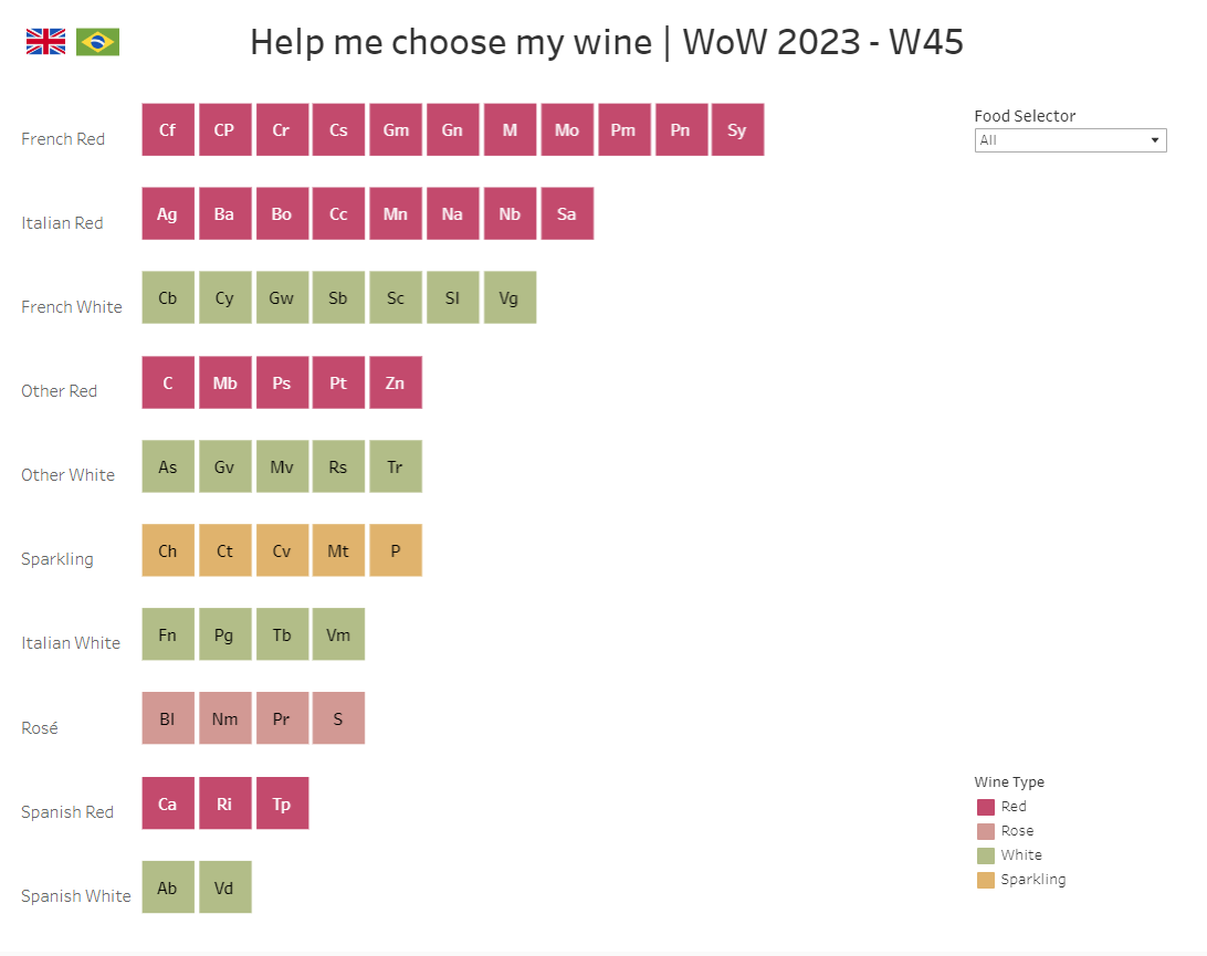 Enquanto eu estava criando a Tabela Periódica do Vinho, eu gostaria de ter incluído uma opção que permitisse o usuário escolher um tipo de comida e, em seguida, destacar apenas os vinhos que harmonizassem com os pratos selecionados. Fiquei um bom tempo procurando uma forma de adicionar esse recurso, mas decidi seguir a filosofia do ‘Antes feito que perfeito’ e postei o painel do jeito que estava.