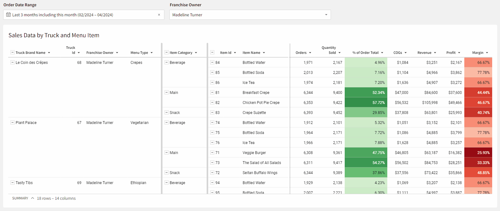 - First Grouping level: Truck Brand, Truck ID, Owner, Menu Type