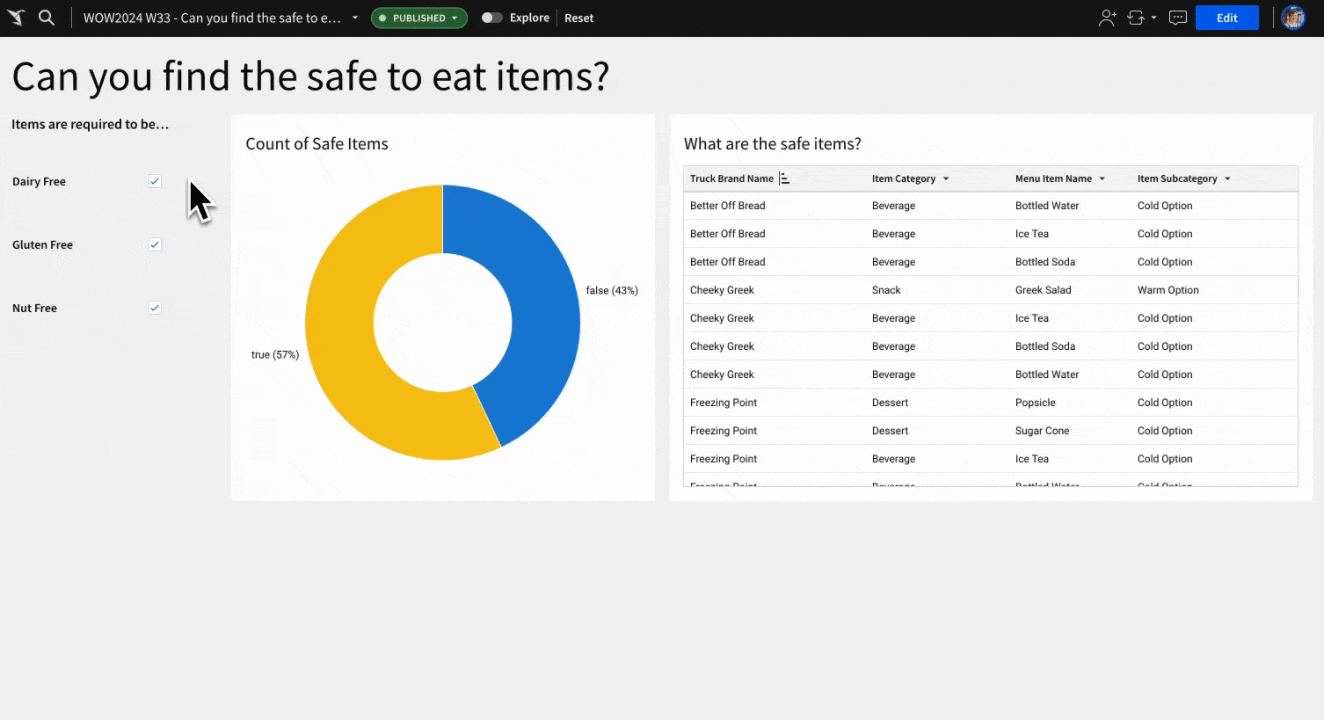 - Create a donut chart with Safe to Eat on the color and Row Count on Value