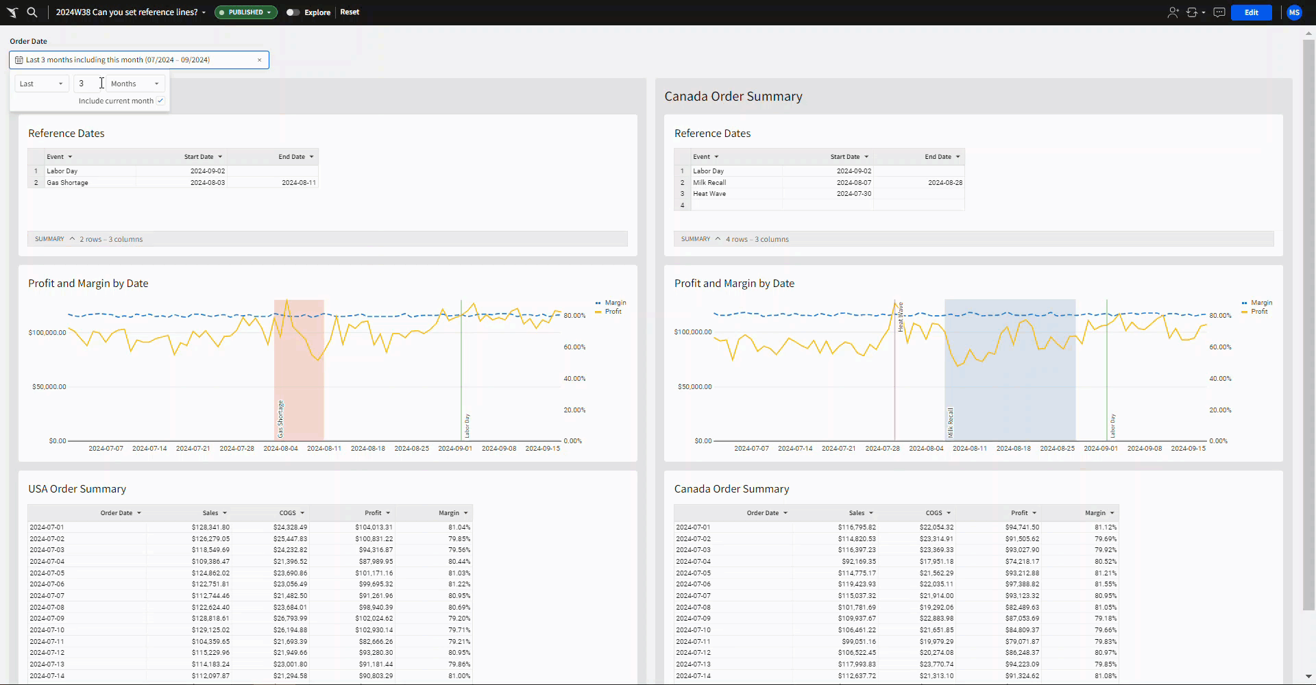 - Create a line chart called Profit and Margin by Date, showing Profit over time and Margin over time. Make sure Margin is the right Y-axis, and format it to be a dashed line.