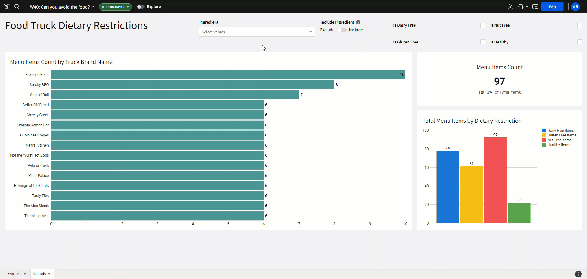 • The solution up to here allows users to show data that includes the specified Ingredient.  In this case, it might make sense to allow users to dynamically choose whether they want to include or exclude the Ingredient.