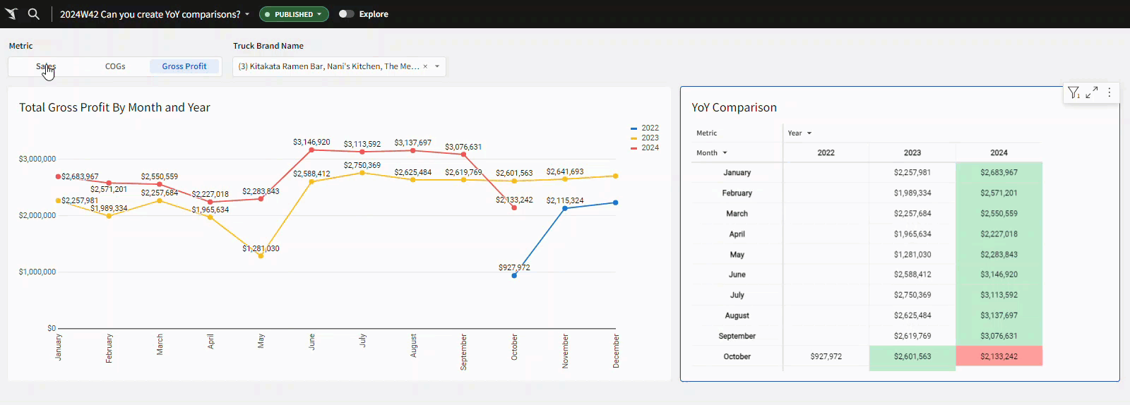 - Use a switch function in your pivot table values to display the total sales, cogs, or gross profit depeneding on what is selected in the new segmented control.