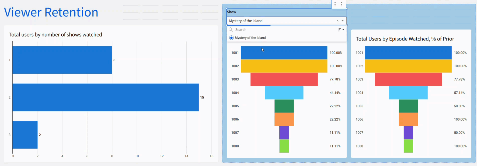 This week we pretend to be a streaming service, trying to see which of our 3 new shows are doing well with the viewer base. Funnel charts will be our main focus here, but feel free to play around with the sample data to find other key insights!