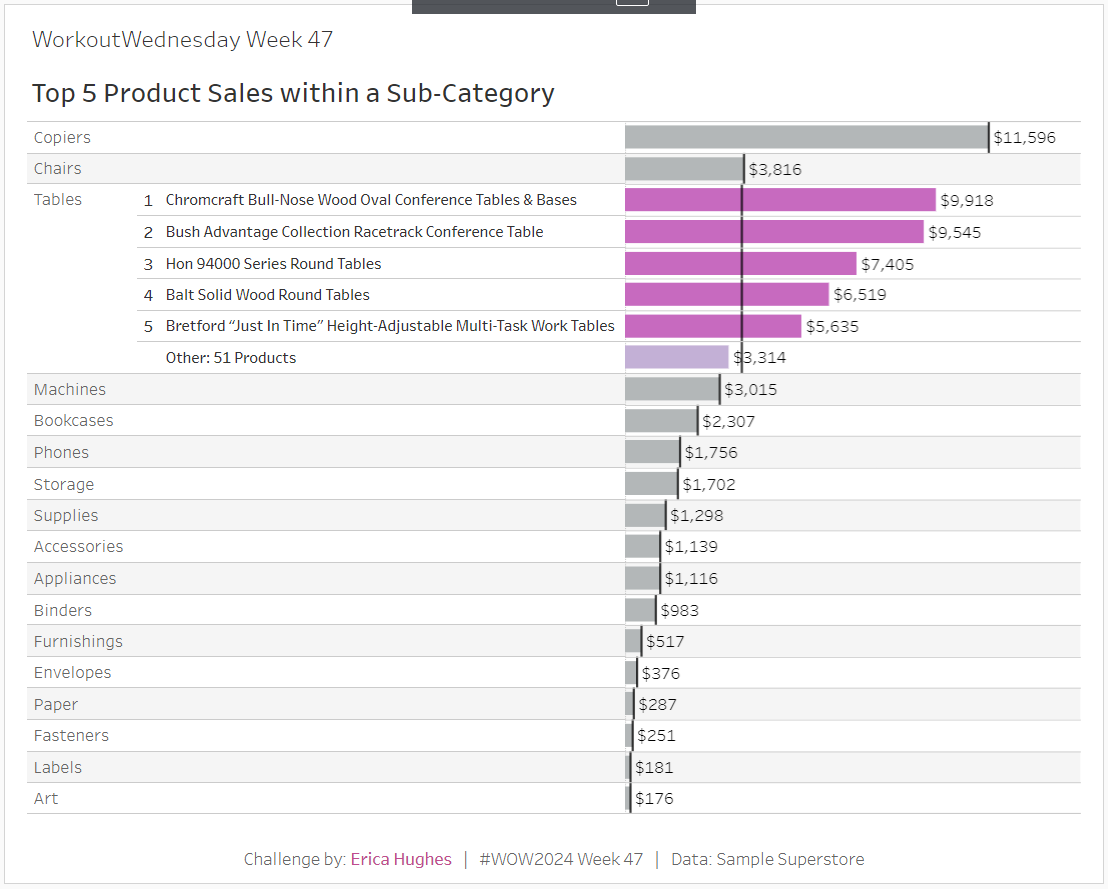 This week’s challenge was inspired by a suggestion that I made to a colleague when he faced the problem of having a small space to work with, but wanting to give the end user the ability to drill-down a bit deeper. His idea was to only show the Top 5 within a selected Sub-Category. I suggested he include the remaining values in an aggregated ‘Other’ bar.