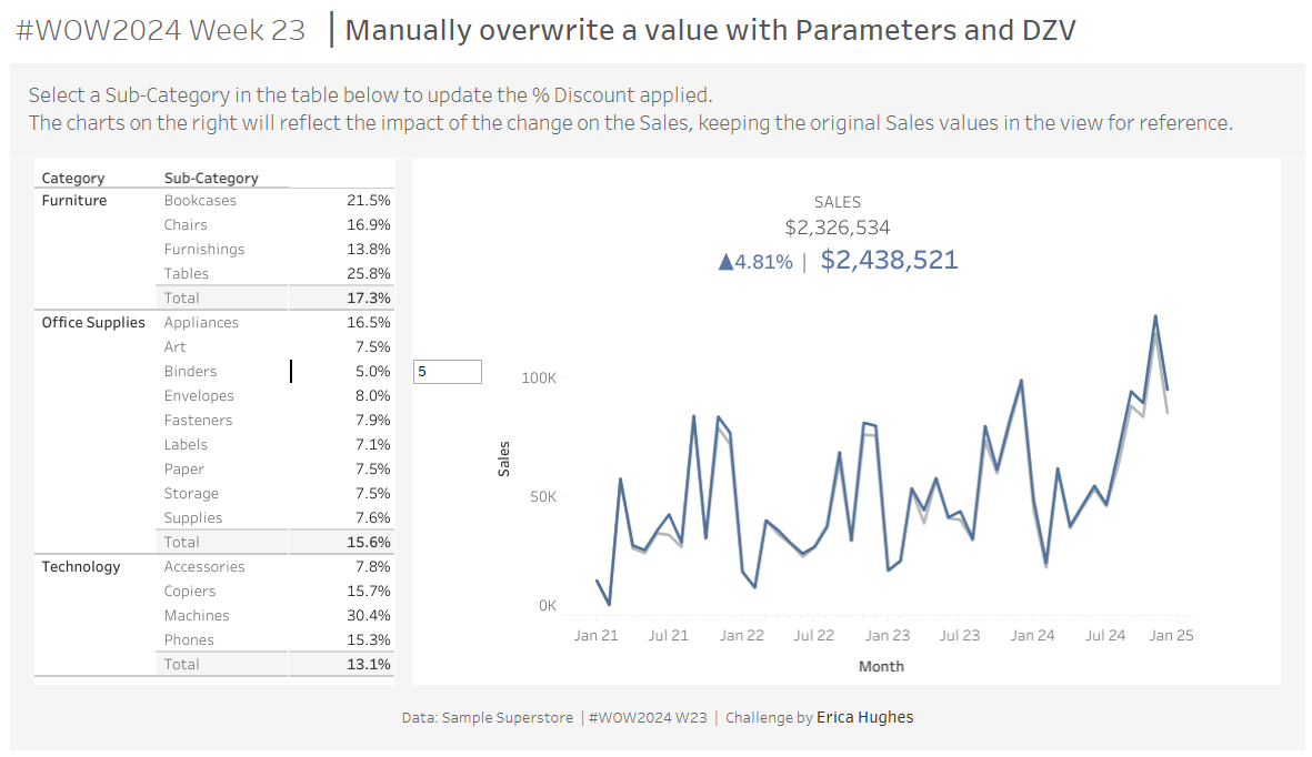 - Allow the user to overwrite the Average % Discount for a single Sub-Category (the value should update in the Table)