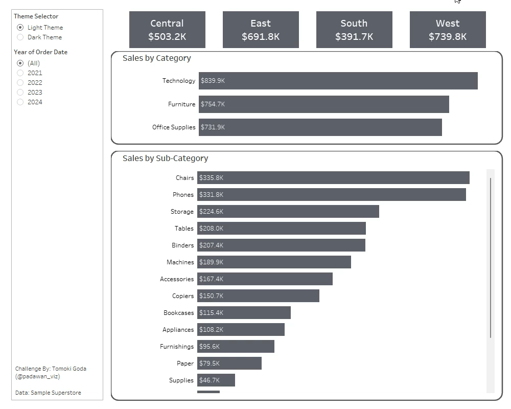 The challenge encourages you to implement a theme switcher on their dashboards, pushing Tableau’s design capabilities to the next level. I hope you enjoy this challenge!