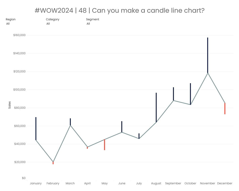 So what are doing this week? We’re gonna play different mark types on dual axis. This week’s challenge is something I’m calling a “candle line” chart. Check it out and have fun recreating it!