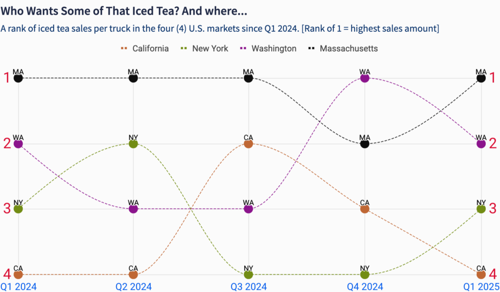 Bump charts are a great way explore changes in rank over time. They’re also a snazzy way to gamify your data and create some friendly competition. A bump chart is more interactive with a continuous time field – the chart changes when a new date part occurs.