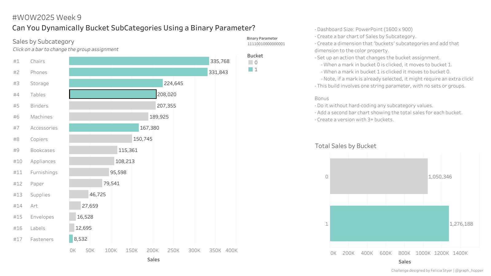 I’m so excited to be partnering with fellow Kansas Citian & Tableau Visionary, Felicia Styer, for this week’s challenge. Recently she created a framework for what she calls “binary parameters” which allows for a solution for multi-select parameters.