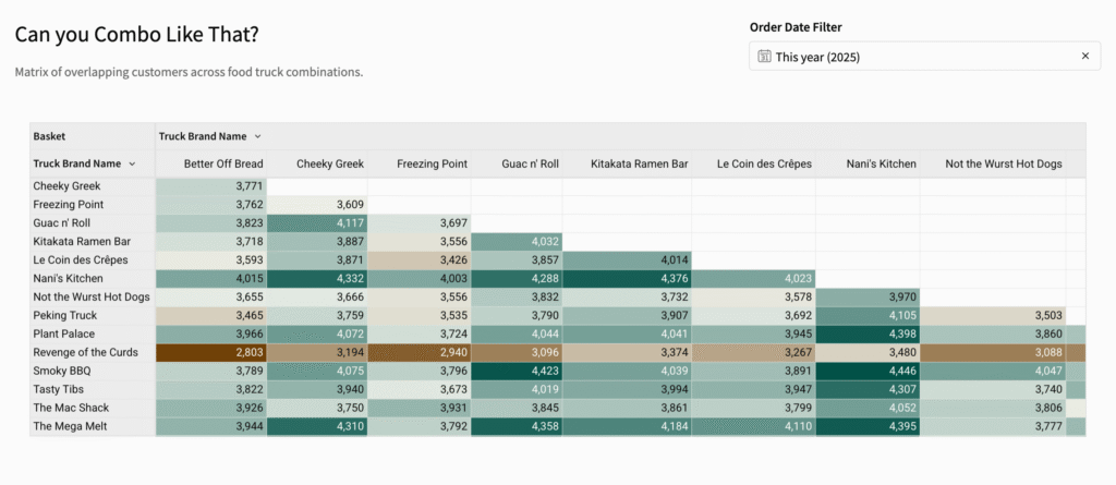 Introduction This week, we’re building a market basket or matrix analysis to help us understand the frequency of combinations. For this week’s challenge, we’re looking at which Food Trucks have the most customers in common. Have Fun! Katrina Need access to Sigma? Click Here to Sign Up Link to WOW Sigma Instance Youtube Click here […]