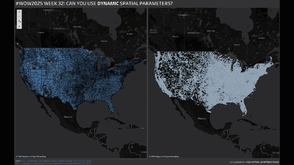 Introduction Tableau has released several spatial capabilities over the last year, and they continued that trend in 2025.2, adding dynamic spatial parameters, which allow you to filter data by map viewport, among other things. We’ll go back to the US school data I’ve used for the other spatial challenges we’ve done this year, so this one […]