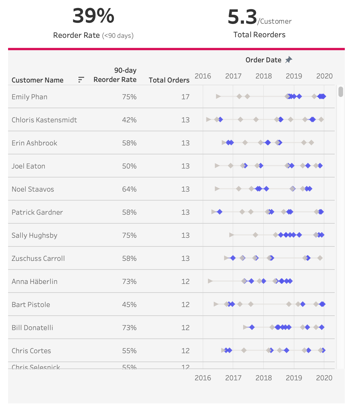 • Create a KPI for the overall 90 day reorder rate. This should only reorders (not first orders by a customer. You may only show text on a single mark. Match formatting of the additional text on the KPI.